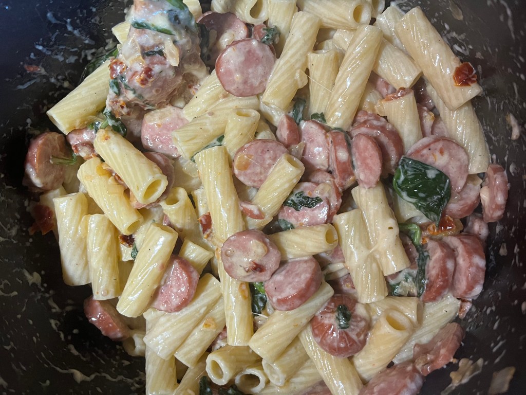 Heat oil in a large skillet. Add the shallots and garlic to the pan and saute until tender or translucent.n Next, add to this skillet the sliced smoked sausage pieces and sun-dried tomatoes. Once the sausage has cooked nicely and begins to carmelize a bit, add the spinach leaves and stir in gently and saute until wilted. Set aside.